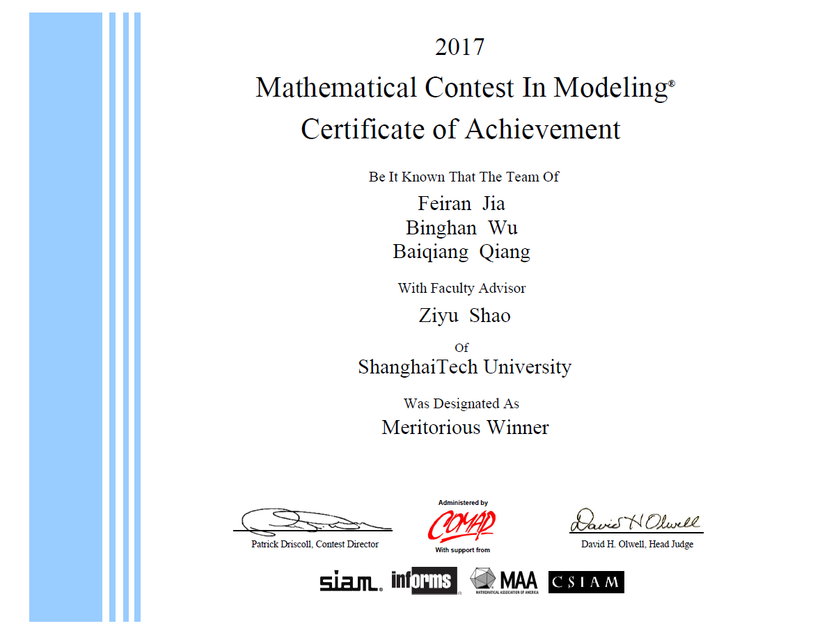 在MCM中获得C题目一等奖的吴秉翰同学表明,当时看到题目之后马上就想到了元胞自动机。这种用随机的思想去模拟复杂的问题的想法,是指导老师邵子瑜老师随机过程课中所教授的,而这样的思想很快的让他找到了解决问题的基本方法。当问及获得M奖的感受,同队的贾斐然同学回应到:当我告诉队友我们获得M奖的时候,队友甚至不知道M奖是一等奖。我们当时是有点惊讶的。比赛前一天的夜晚我刚完成前一学期的最后一项作业,第二天在还没睡醒的情况就和队友开始了比赛,因而并没有做好准备。由于对比赛的流程不是很熟悉,在最后还是犯了一些错误——比如C题除了答卷还要交一份信。我们最后就没交,比赛结束检查还发现Summary里存在很多乱码,以为要与奖项失之交臂了。对于如何在这么短的时间完成建模并交付一个不错的答卷,她认为,其实上科大的同学们在课业内已经具有了相对宽广的视野,对于不同学科、不同思想都有了一些见解。邵子瑜老师的计算机网络课就是从数学建模的角度去分析网络,在讲述网络的过程中给同学也打下了一定的数学基础和建模思想,当看到这个题目的时候就马上能想到用博弈的方法去分析车流的互动——这是一个相对比较少见的角度,在搜索了大量资料后发现只有极少数文献讨论了这种方法,而结果并不理想,于是就与队友一起去探索这种方法。而队友思想活跃,数据分析能力较强,加上互相配合好,最终也获得了较好的结果。