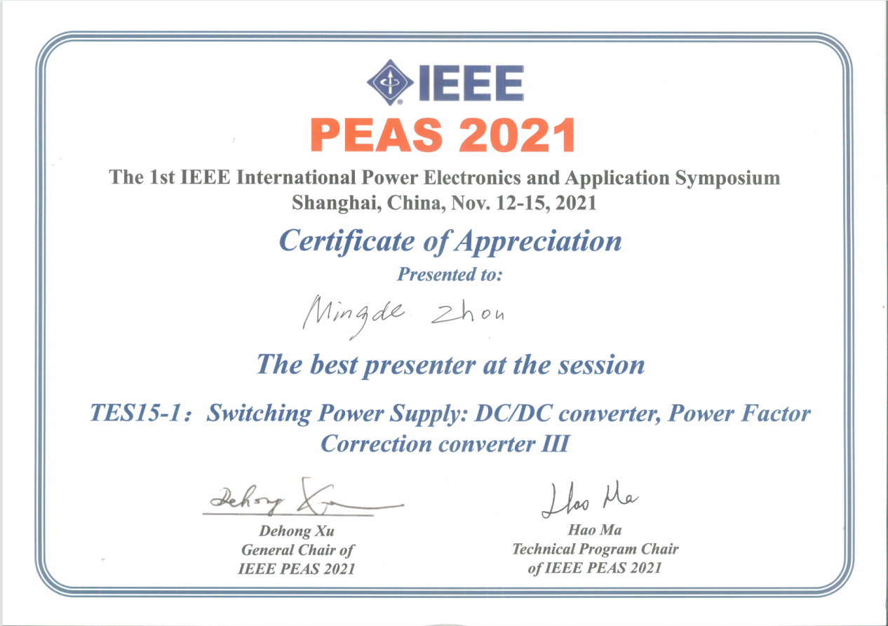 11月12日到11月15日, 首届IEEE 国际电力电子与应用研讨会(IEEE PEAS)在上海松江召开。信息学院智慧电气科学中心(CiPES)电力电子与再生能源实验室(PEARL)周明德同学在Switching Power Supply: DC/DC converter, Power Factor Correction converter III分会场做了口头报告,题为“A SiC-Based Highly Integrated Bidirectional AC/DC Converter for PEV Charging Applications”,并收获了该分会场的最佳报告奖(best presenter)。