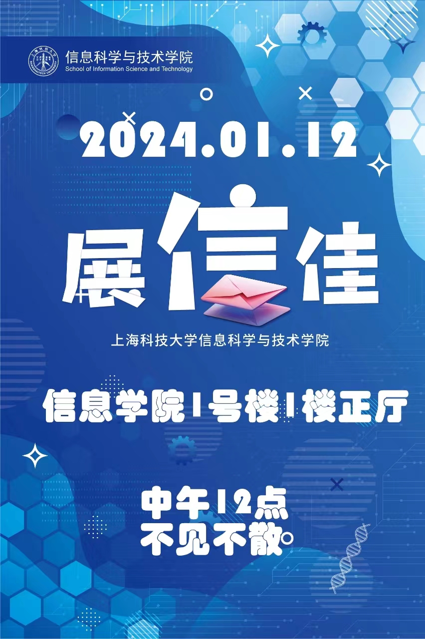 一年一度的“展信佳——SISTor相聚日”将在2024年1月12日(周五)中午12:00如约而至。请按时到信息学院1号楼1楼正厅,来共度一段愉快的午间时光,和教授同学畅谈,在SIST向未来say hi~