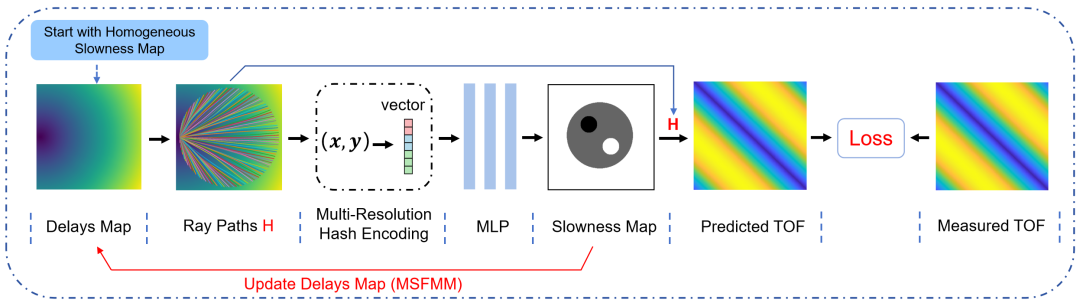 超声CT声速成像主要通过反演声传播物理模型重建图像,该反演问题高度病态(ill-posed),求解对噪声高度敏感且容易陷入局部最小值,导致重建结果不稳定。传统优化方法(如高斯-牛顿法)所重建的声速图像在非理想数据约束条件下,容易产生伪影、并且重建鲁棒性较差,当数据中存在噪声时常常出现重建失败的情况。因此,使用传统方法重建图像时,需要对超声信号进行大量的数据清洗工作,最小化噪声带来的误差。BentRay-NeRF方法使用多层感知机(MLP)构建连续的慢度场(声速场的倒数)的隐式神经表示(INR),使其在空间上更加平滑,更好约束图像重建的反演问题(图1)。INR可以减少由传统离散网格表示方式带来的插值误差和高维求解空间带来的重建不稳定性。此外,该方法结合了多分辨率哈希编码,使得MLP能够更好地学习空间细节信息,从而在重建过程中更高效和有效地恢复边界的高频细节。相比于传统的优化方法,BentRay-NeRF在有限数据约束和使用带噪超声信号的情况下仍能更好地抑制伪影,提供更准确和更稳定的声速反演结果(图2)。