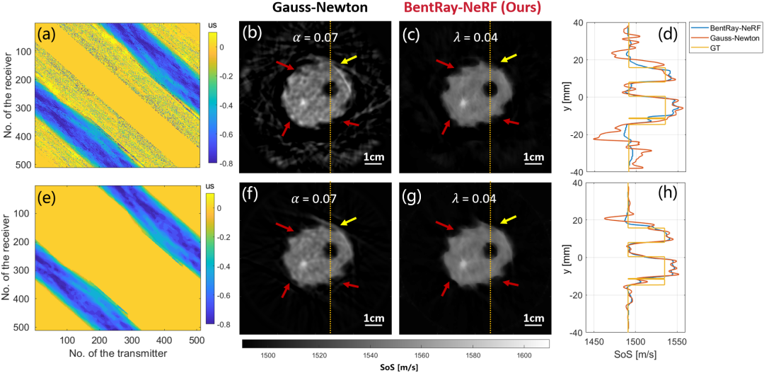 图2 琼脂仿体声速图像重建结果。(a)未经过滤波处理的超声到达时间信号。(b)高斯-牛顿法和(c)BentRay-NeRF方法重建的声速图像,以及(d)仿体内部选定的轮廓线比较。(e-h)经滤波处理的超声到达时间信号,及其对应的重建结果。GT:ground-truth。