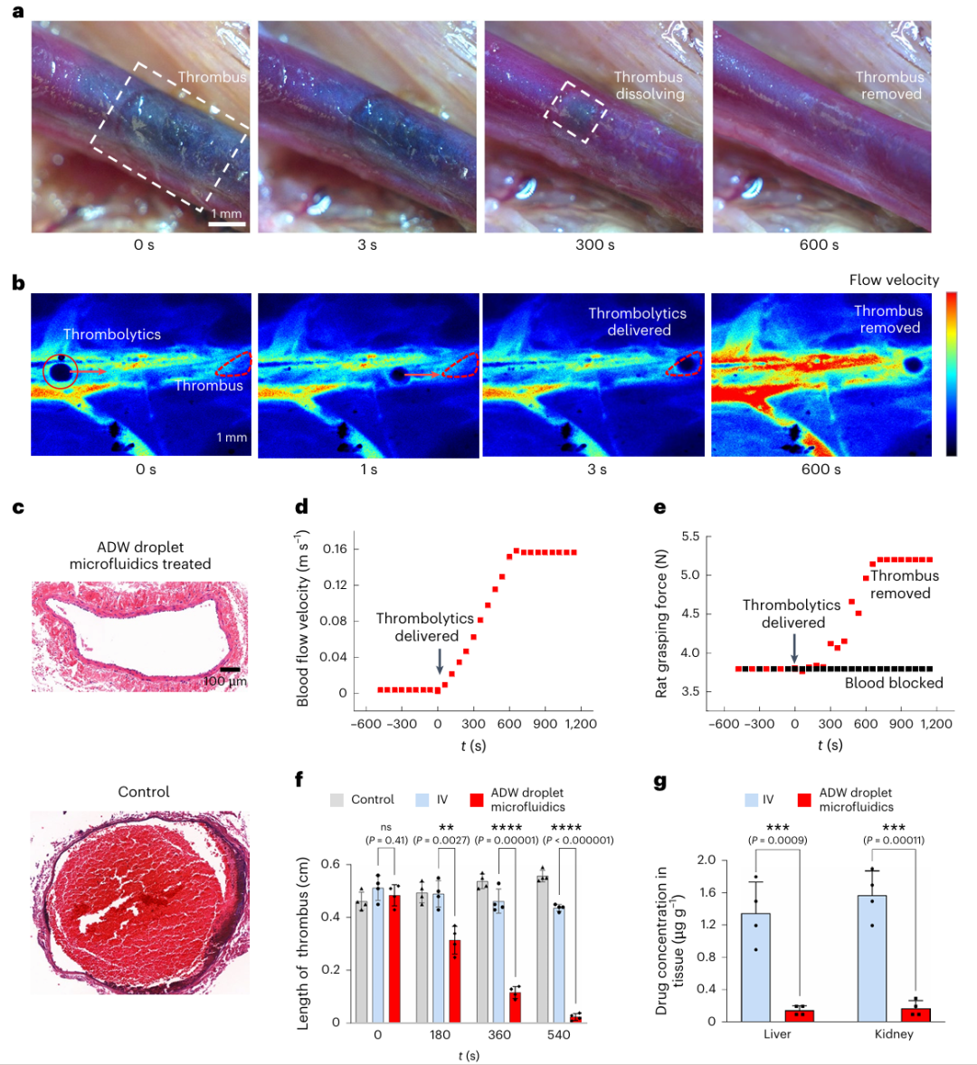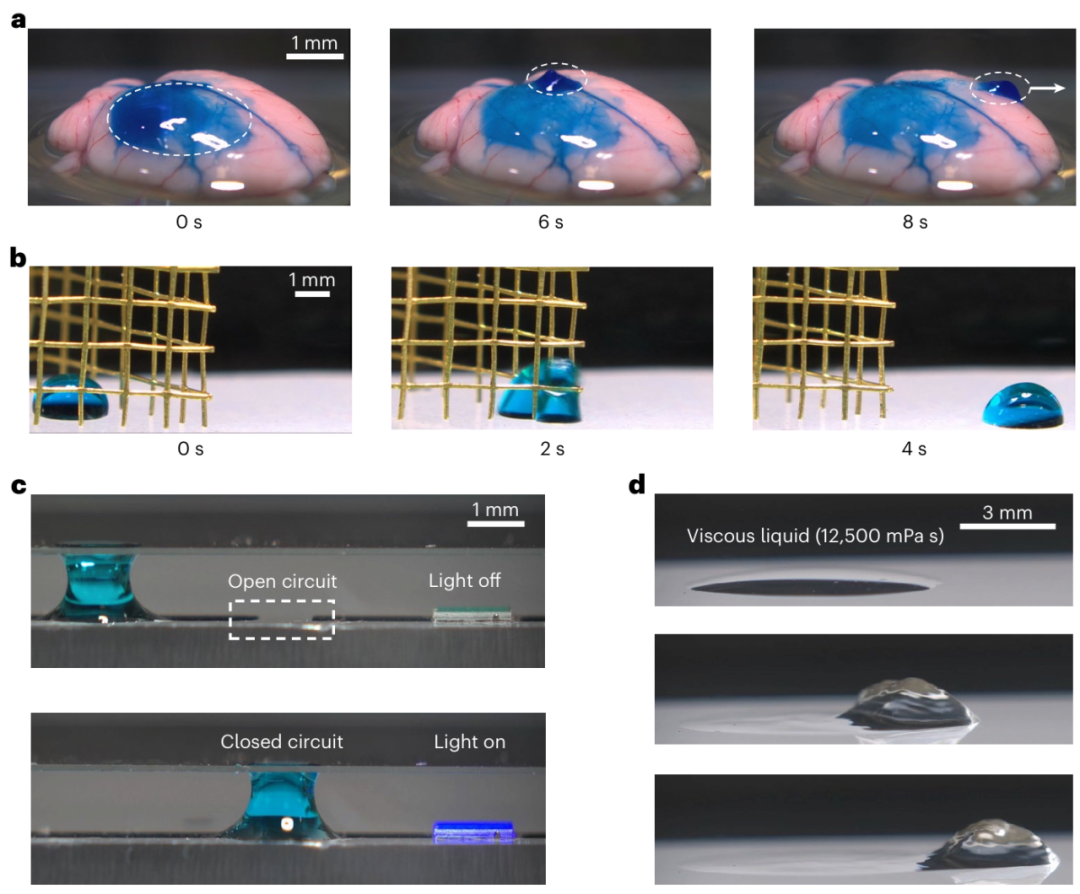 通过在活体组织等超亲水界面上实现高速、稳定、无残留的液滴操作,声致去润湿技术显著拓展了微流控平台在 体内诊疗、精准药物递送 等临床场景中的可用性。该技术在 血栓清除、封闭空间液桥操控、超高粘液体控制 等多类型液体和多物理边界条件下均展现出卓越性能,验证了其跨尺度、跨介质的广泛适应性。同时,其无需界面图案化或材料改性即可实现远程精密操控的特点,也为 智能软体机器人、绿色化工反应器、微型能量系统、可编程液滴计算平台 等新兴领域提供了高度兼容的新型液体调控方案,展现出推动多学科融合与技术转化的巨大潜力。