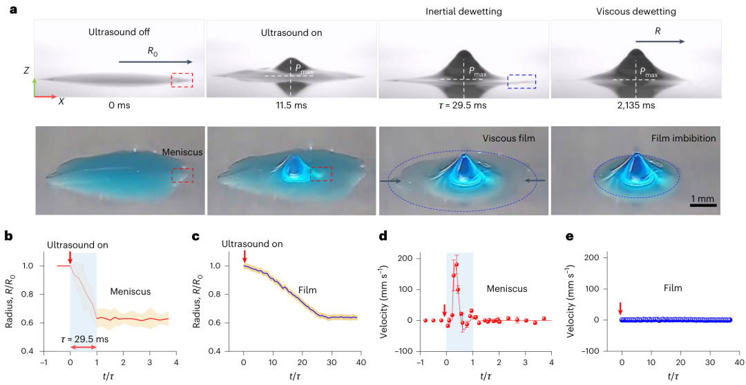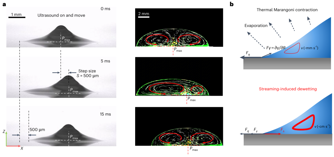 图1:将超声波聚焦在液滴内部引发“声致去润湿”效应。