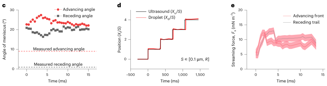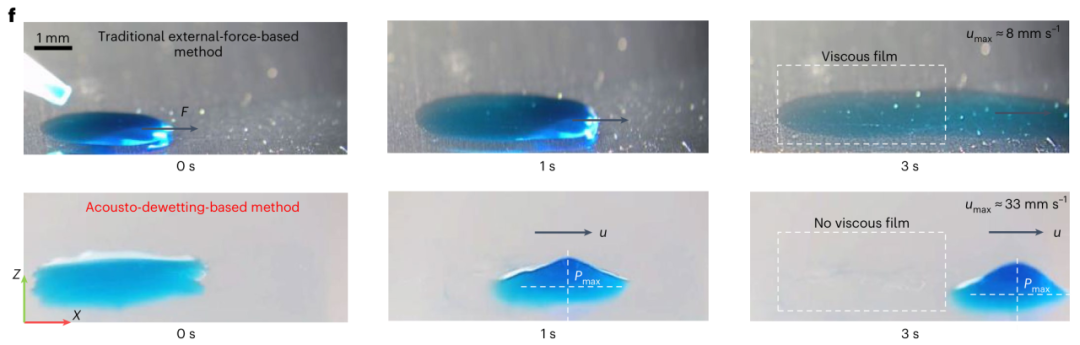 实验结果显示,在 声致去润湿(Acousto-dewetting) 作用下,液滴三相接触线的运动速度可达 33 mm/s ,该速度远超水膜形成的临界值,有效避免了传统操控过程中因液膜残留导致的操控失败问题,解决了长期困扰超亲水表面液滴微流控的技术瓶颈, 突破了经典润湿理论的局限。