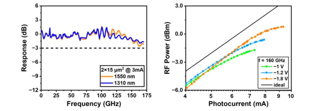 在具体性能方面,器件在1550 nm波段实现 0.52 A/W 的响应度,在1310 nm也保持 0.35 A/W,同时在-1 V偏压和3 mA光流条件下,测得3-dB带宽超 170 GHz。在160 GHz频点处可实现 0.77 dBm 输出功率,具备优异的线性与饱和性能。通过对电场分布、漂移区长度及载流子过冲效应的精准设计,器件在不牺牲带宽的前提下保障了高SNR与稳定性,显示出在数据中心短距通信与相干互连系统中的广泛应用潜力。