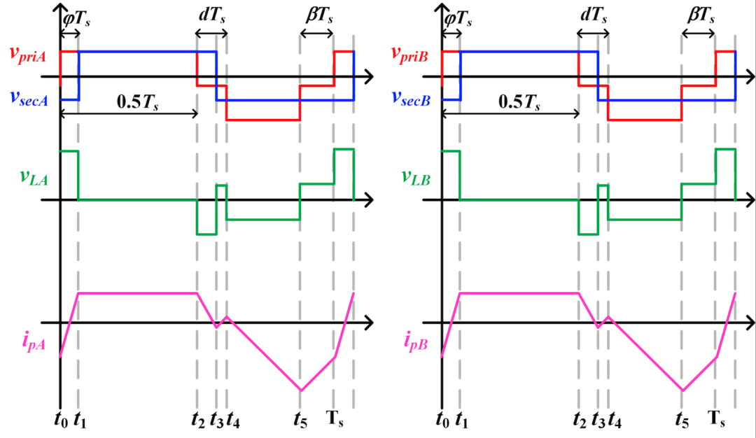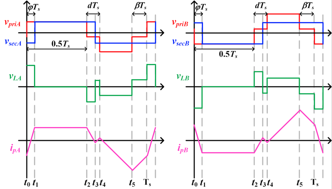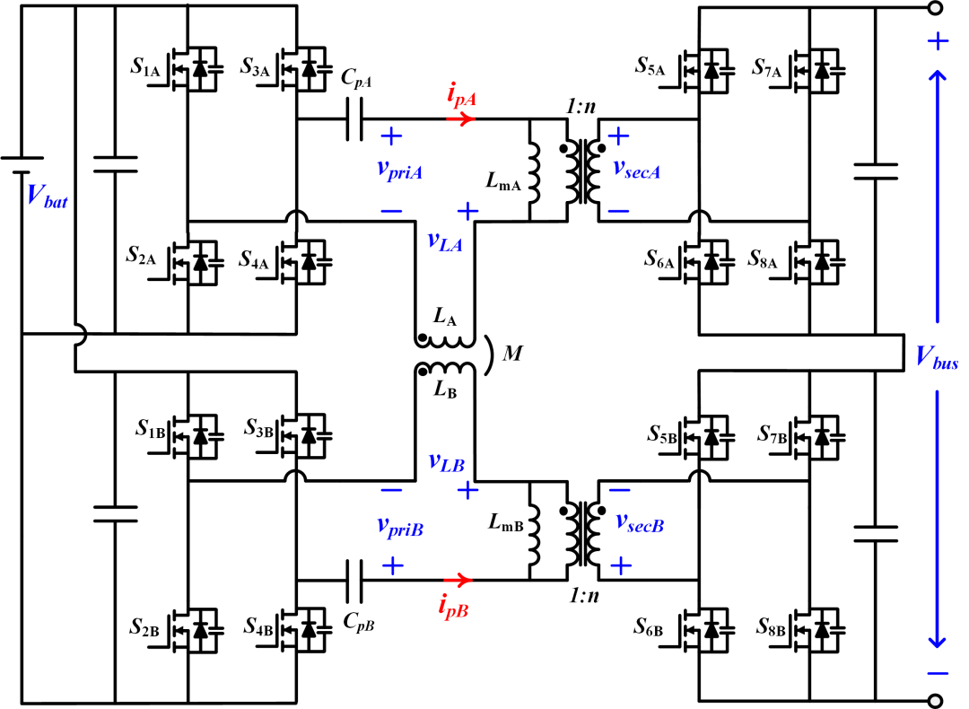 此外,两个DAB模块中的独立电感被替换为一个耦合电感,通过调制控制其激励方向,实现等效电感值的两档调节,无需额外电路。根据电压增益与功率需求,系统可动态切换激励模式,在重载下优化环流,同时保持轻载下的软开关能力,兼顾全负载范围高效运行。
