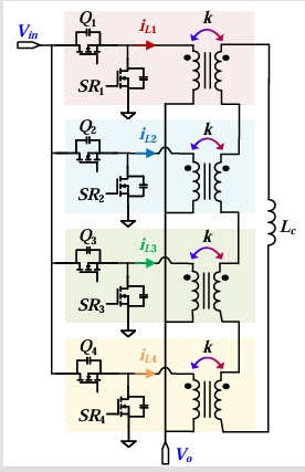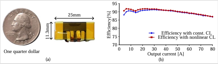 虽然TLVR系统通常可以采用“切相(Phase Shedding)”技术来降低轻载时的损耗,但由于各相之间存在较强的磁耦合,限制了该策略的实际效果。针对这一挑战,王浩宇团队设计了一种“非线性耦合电感”结构(图3)。该电感在轻载条件下能够自动减弱各相之间的耦合强度,同时提高电感值,从而有效降低电流纹波,提升系统效率。实验结果表明,在一个4相、12V/1.8V、80A的TLVR系统中,新方案在轻载状态下实现了效率提升2.5%的显著效果。这项工作为未来数据中心实现智能化节能提供了新的技术路径。