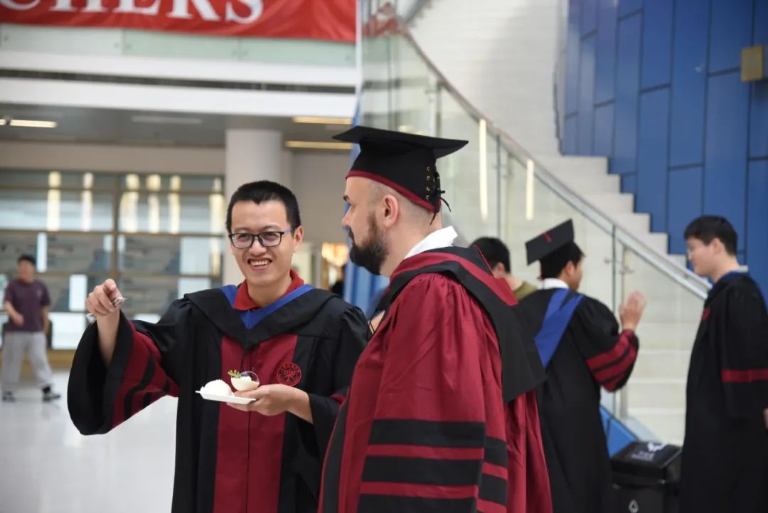 典礼尾声,虞晶怡院长与毕业生代表共切“一路生花,繁花似锦”为主题的庆祝蛋糕,开启祝福时刻。师生执盏畅叙,大厅里弥漫着蛋糕的甜意,导师欣慰回顾科研点滴,学子畅谈未来规划,当最后一口甜味化在舌尖,这场甜蜜仪式已悄然转化为启程的力量。