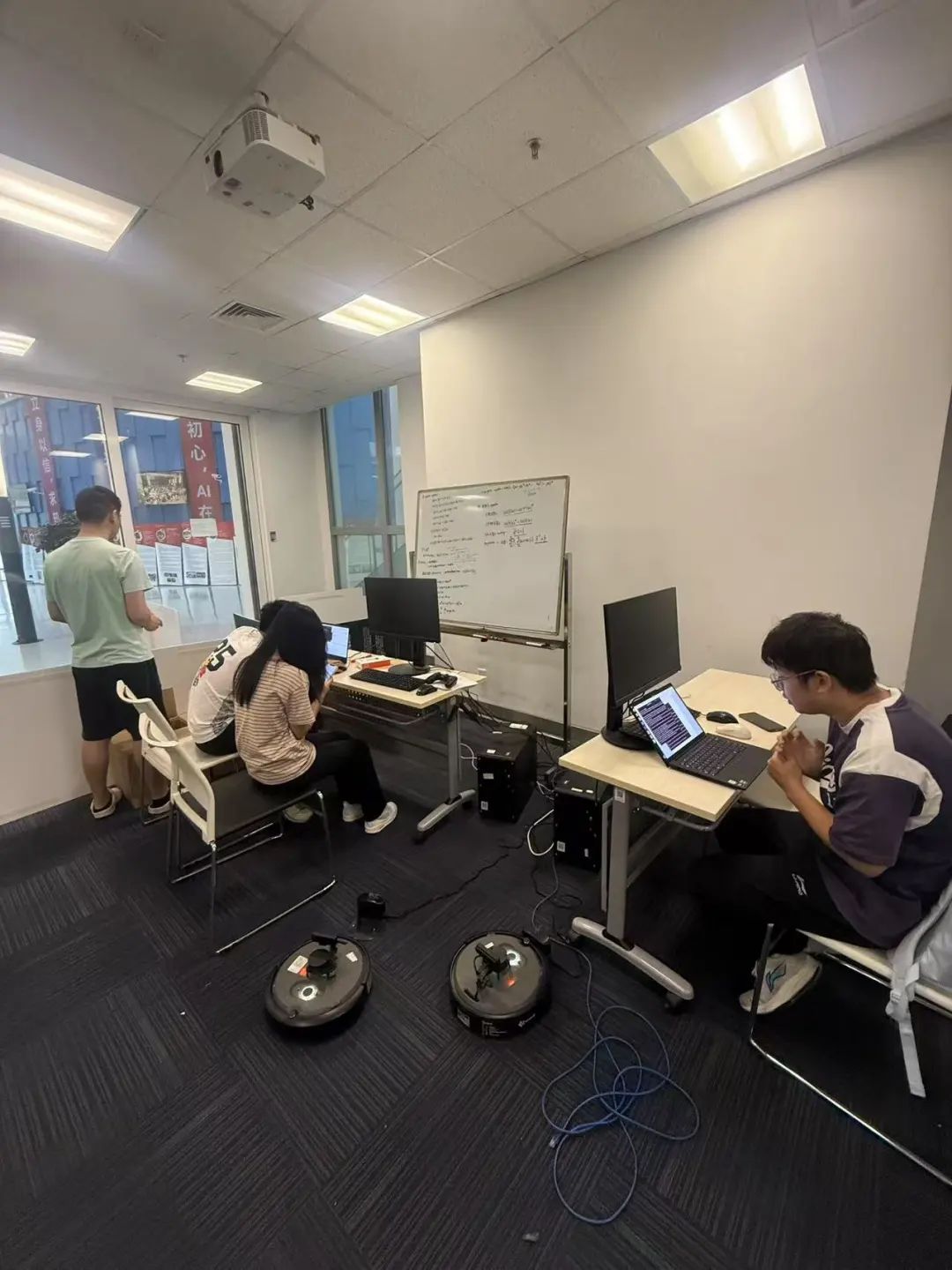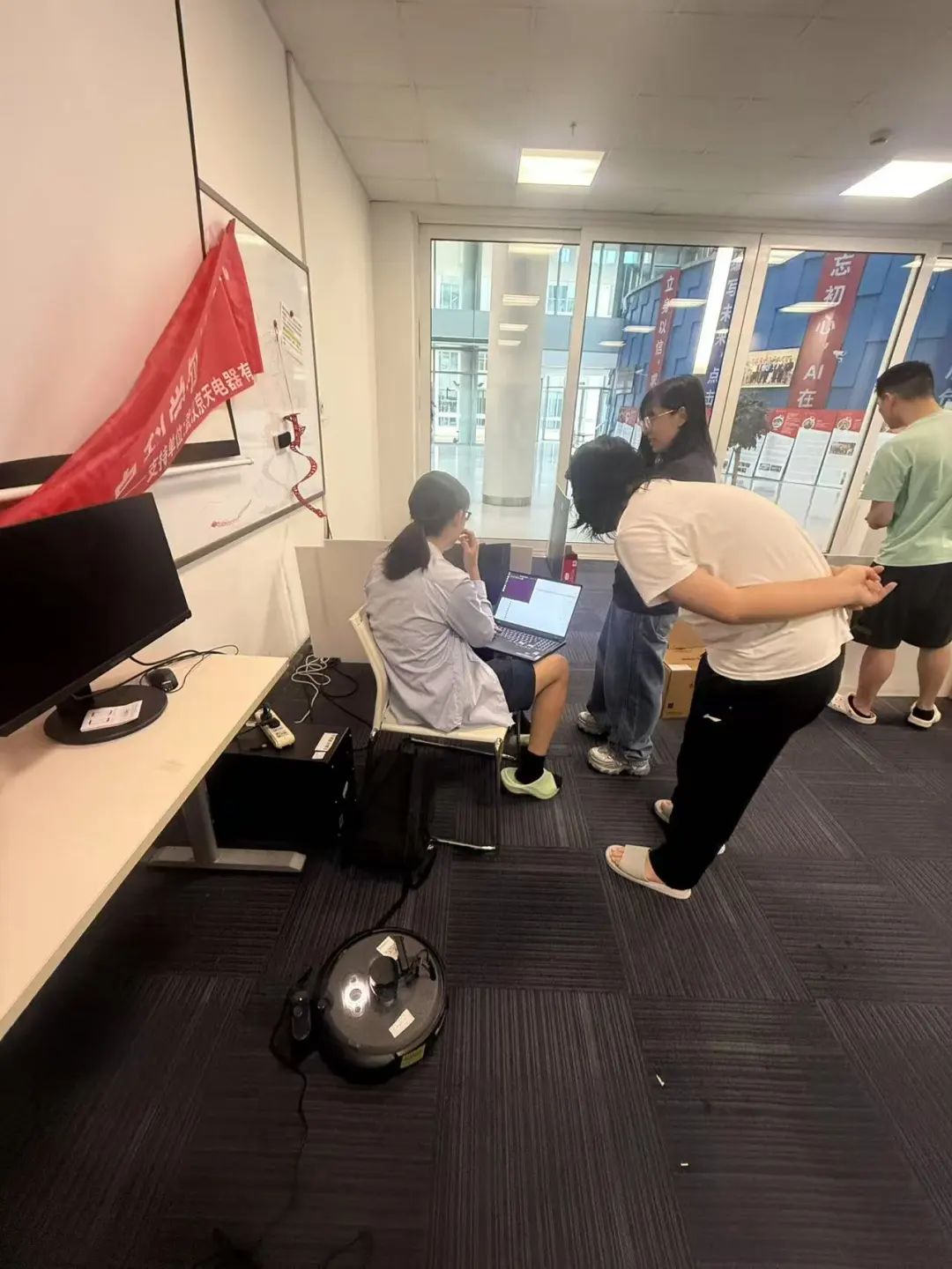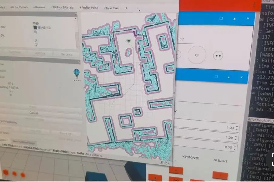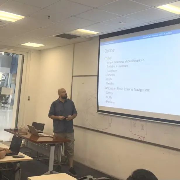 实操培训由计算机与通信学科平台工程师吕坤勇、王永丽,设备厂家工程师陈安琪,学生助教王跃众共同指导。实操培训分为Gazebo仿真和真机操作两个阶段,要求同学们实现机器人自主导航并探索新的全局路径规划算法。此次培训吸引了24位同学参加,3-4位同学组成一组,共分为7组进行。各小组相互讨论、协作,共同学习移动机器人理论知识和实操技能。