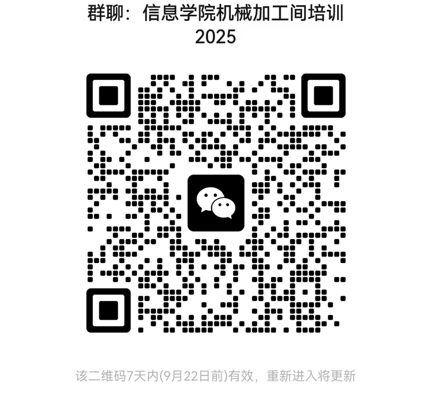 请有意参加培训的老师或同学扫描下方二维码加入到信息学院机械加工间培训群,后续通知将在微信群内发布。