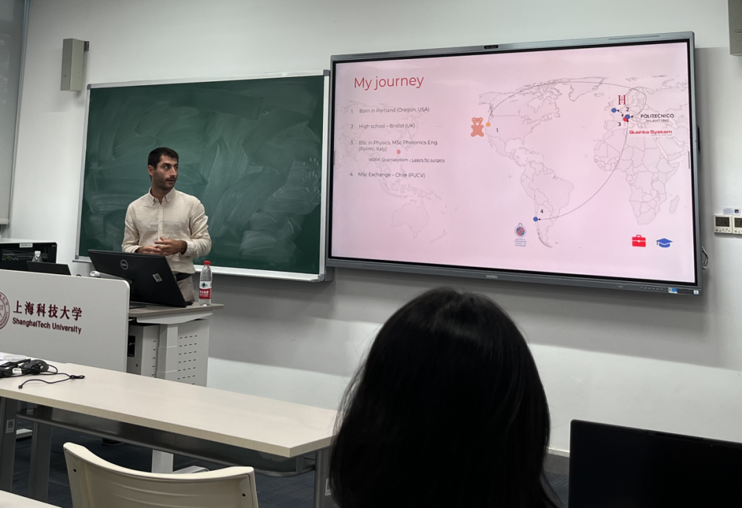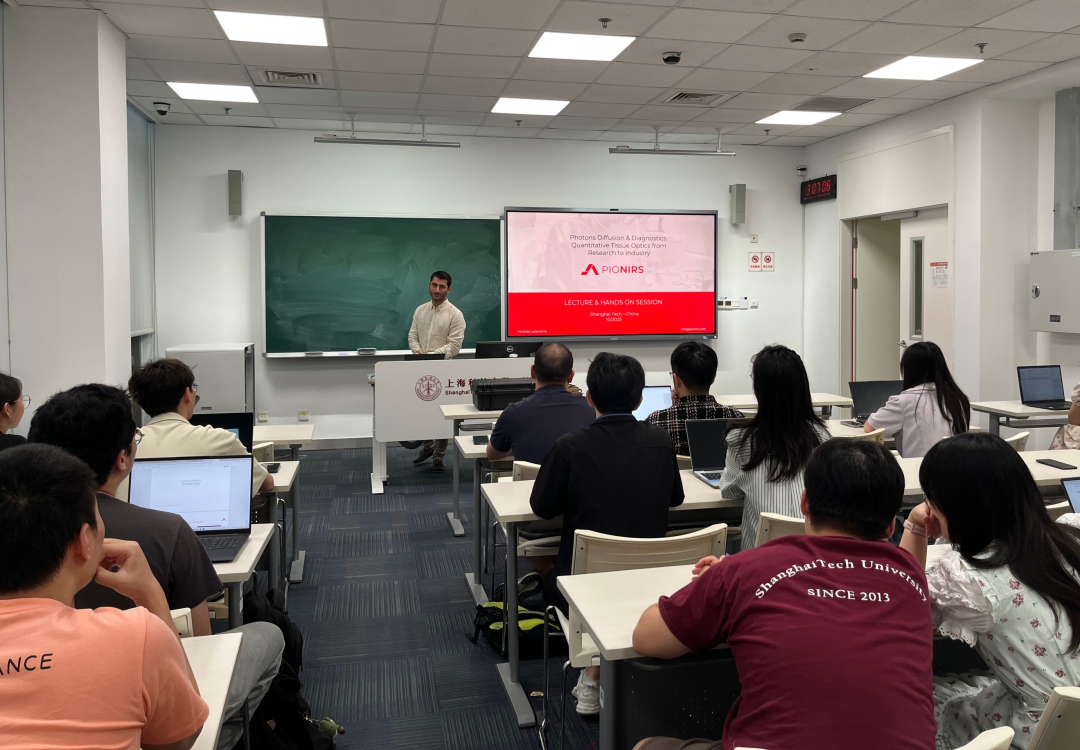 近日,《生物医学光子学及成像》课程(EE280)国际前沿系列专题讲座在上海科技大学信息学院举行。本次活动由信息学院任无畏教授组织,特邀意大利米兰理工大学博士、PIONIRS公司联合创始人Michele Lacerenza担任主讲嘉宾,围绕“光子扩散与诊断:从研究到产业的定量组织光学”这一主题,通过专题报告、案例解析与设备演示等环节,系统介绍了时间域近红外光谱技术(time-domain near-infrared spectroscopy, TD-NIRS)在组织血氧定量监测与脑功能成像中的最新研究进展与临床应用前景,为生物医学光学的产研融合提供了实践路径与经验启示。