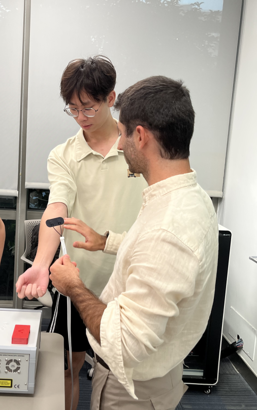 在技术展示环节,Lacerenza博士介绍了由团队研发的便携式TD-NIRS设备:NIRSBOX。该系统使用了先进的单光子探测雪崩二极管(Single-photon avalanche diodes, SPAD)技术,达到了皮秒级别的时间分辨率以及单光子探测的灵敏度。同时,该设备采用多波长脉冲激光光源,可实时、无创、定量监测氧合血红蛋白、脱氧血红蛋白、总血红蛋白以及组织氧饱和度等多个生理参数。在此基础上,Lacerenza博士围绕典型应用场景进一步以实证结果展示TD-NIRS的监测能力:在神经血管耦合研究中,手指敲击与行走任务可观察到对侧运动皮层的血氧动力学变化;在运动生理与康复场景,肌肉收缩与恢复阶段的氧合曲线显示良好可重复性;在儿科研究中,不同年龄段脑与外周组织氧合的参考分布为个体化评估提供了基线。在设备演示与互动环节,Lacerenza博士现场邀请学生协作完成设备连接、软件设置、实时采集与结果解读;探头置于自己的前臂或额部,界面同步显示曲线与数值,在轻按、放松、深呼吸等动作下呈现即时变化,并结合“时间飞行”信息说明TD-NIRS如何区分吸收与散射、实现绝对定量。师生还就重复性、抗运动伪影与深层敏感性展开互动问答,现场互动积极,交流效果显著。