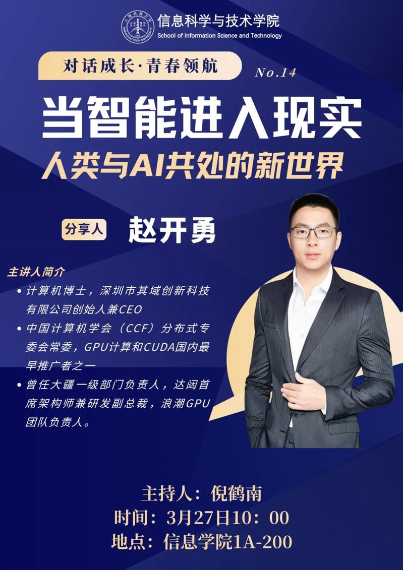 对话成长,青春领航 为了进一步推动知识的传播与共享,全方位提升我院学生的综合素养,并为同学们照亮职业发展的道路,学院将开展“对话成长,青春领航”系列活动。活动旨在构建校友/业界翘楚与在校生心灵对话的桥梁,在交流中绽放智慧的火花。 嘉宾介绍 赵开勇,计算机博士,深圳市其域创新科技有限公司创始人兼CEO,中国计算机学会(CCF)分布式专委会常委,是GPU计算和CUDA在国内最早的推广者之一,曾任大疆一级部门负责人,达闼首席架构师兼研发副总裁,浪潮GPU团队负责人。赵开勇兼备跨多领域复合型研发能力,累计发表专著论文60多篇,获授权国内外专利90多项。2009年,组织出版了全球第一本CUDA高性能计算编程专业书籍,在国内外分布式异构计算领域有较大的影响力。 时间地点 活动时间:3月27日c 活动地点:c 活动安排 主持人:倪鹤南 讲座主题:当智能进入现实:人类与AI共处的新世界
