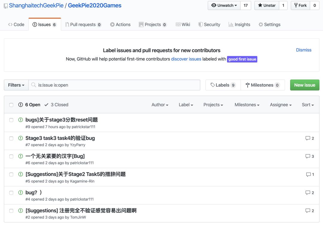 杨易为:我们建立了比赛的GitHub仓库,选手可以在项目的issues界面里及时反馈遇到的Bug以及对比赛的建议。截至目前我们收到了很多不错的反馈,有关于系统漏洞的,关于安全性建议的,也有关于错别字的,我们也都在比赛过程中及时修改更新了。