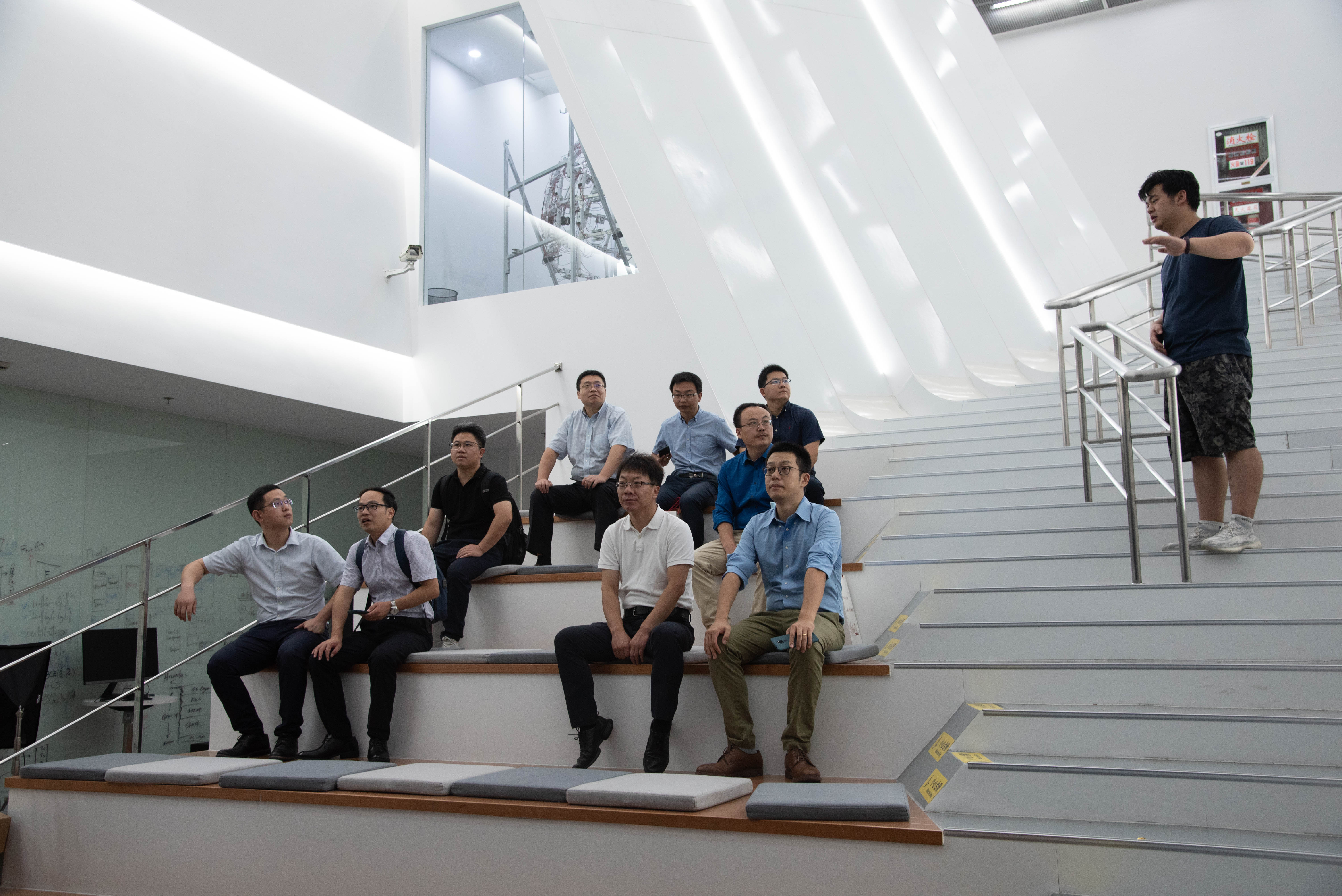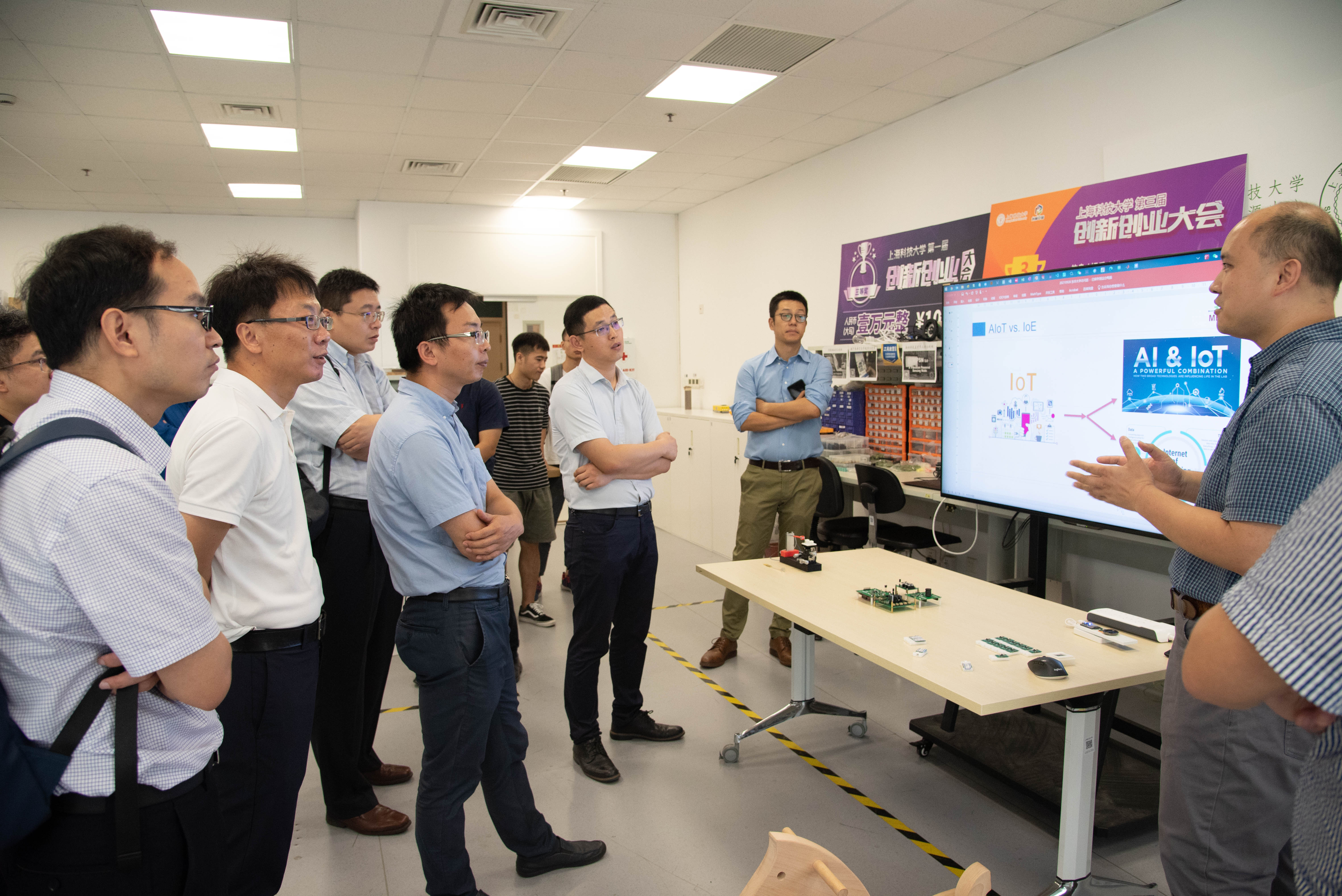 随后,在信息学院会议室举行了交流座谈,参与座谈的还有信息学院助理院长及各中心代表教授。信息学院助理院长周平强首先介绍了上科大的办学历史、区位优势及办学特色,并详细介绍了信息学院的师资力量、学生就业等整体概况。助理院长何旭明重点介绍了信息学院4个联合实验室及2个上海市工程技术研究中心的简况,并以联合实验室举例,介绍了信息学院校企合作的运作举措和成效。