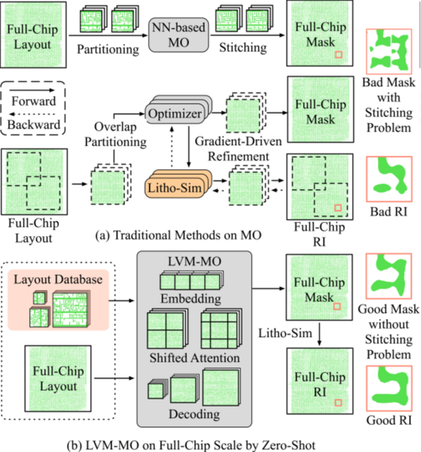 图2 传统掩膜优化流程与基于大视觉模型的全芯片尺寸掩膜优化流程对比图