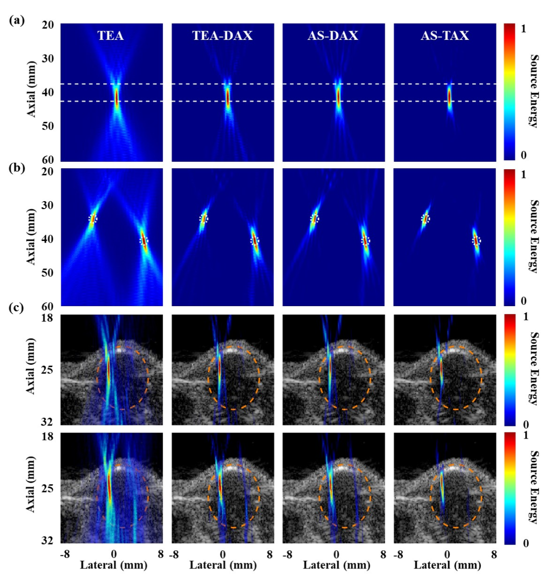 图2 (a-b)仿体和(c)小鼠肿瘤实验的被动空化成像结果。AS-DAX和AS-TAX是本研究提出的新方法。