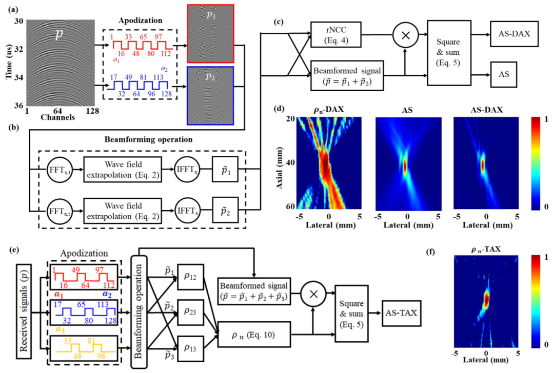 图1 (a-c)AS-DAX的算法原理示意图。(d)DAX空间权重、AS法成像结果和AS-DAX法成像结果。(e)AS-TAX的算法原理示意图。(f)TAX空间权重。