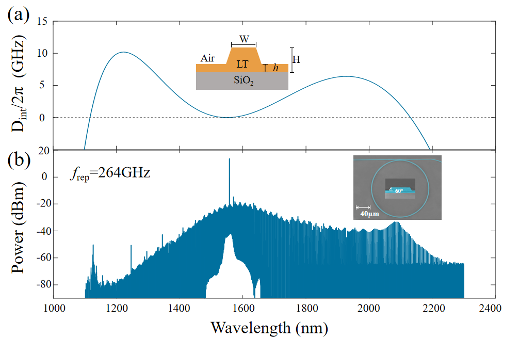 图1 (a) 色散曲线仿真图,插图为钽酸锂波导结构示意图。 (b) 重复频率为264GHz,覆盖 1100 - 2200 nm的倍频程孤子频率梳光谱图。插图为微环结构的伪彩色扫描电子显微镜图像