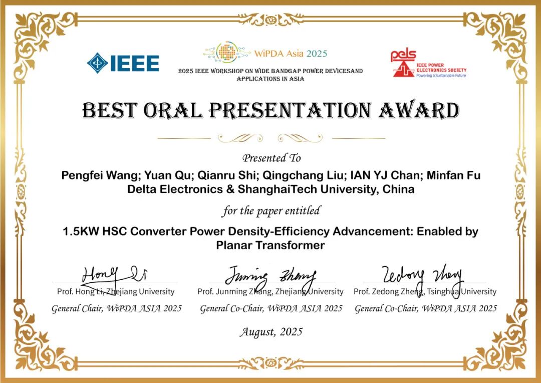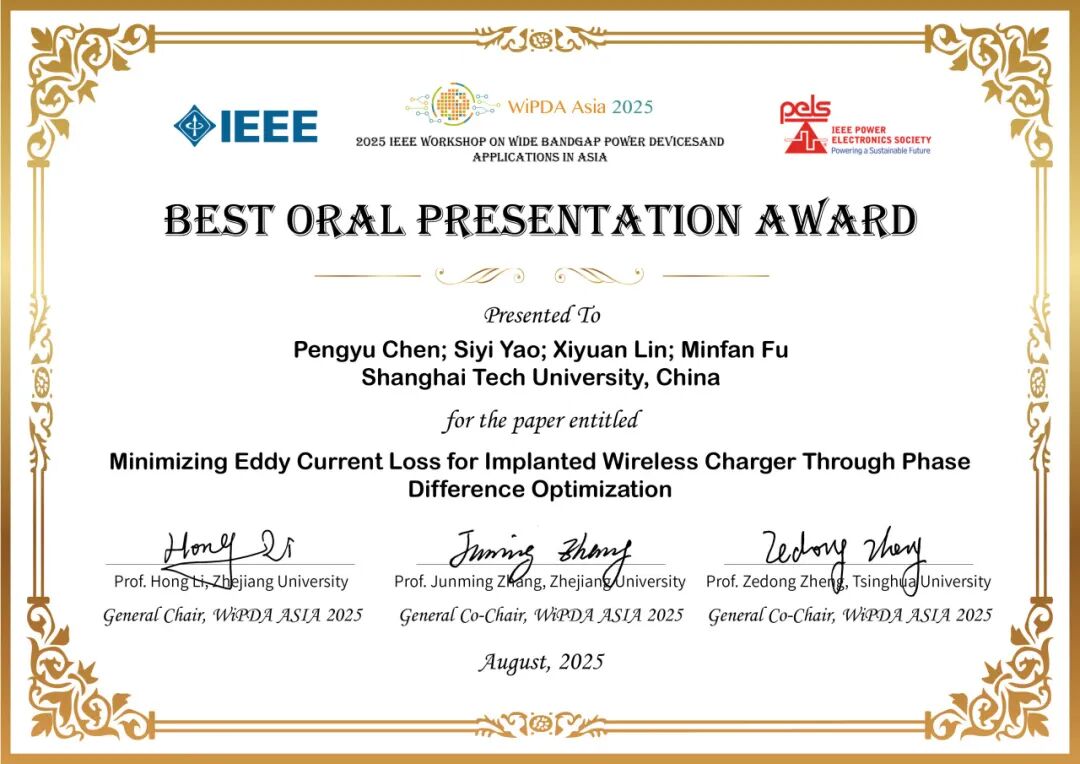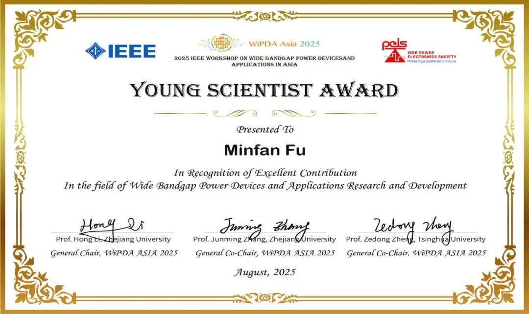 近日,2025年IEEE宽禁带功率器件与应用亚洲专题研讨会(IEEE Workshop on Wide Bandgap Power Devices and Applications in Asia, IEEE WiPDA Asia 2025)落下帷幕。本次会议聚焦宽禁带功率半导体器件及其创新应用的前沿探讨,上海科技大学信息科学与技术学院傅旻帆教授凭借在宽禁带功率器件与应用领域的突出研究成果荣膺会议颁发的青年科学家奖(Young Scientist Award)。其课题组两名专业学位研究生也因汇报表现优异,双双荣获最佳口头报告奖(Best Oral Presentation Award)。这些体现了学校在宽禁带功率器件与应用领域的学术影响力,以及在高层次专业型人才培养方面取得的成效。