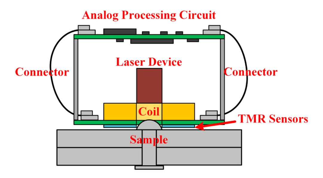 航空器广泛采用铆接多层结构,铆钉周围因应力集中易产生疲劳裂纹,威胁飞行安全,因此有必要及时准确地检测评估铆接位置的安全可靠性。然而,现有的检测方法难以在不拆卸铆钉的情况下有效识别铆钉下的埋藏缺陷。针对这一挑战,研究团队创新设计了一种双同心圆高分辨率TMR传感器阵列探头。该探头可与铆钉同轴对准,显著降低结构干扰;探头采用尺寸仅为0.45 mm × 0.45 mm裸片传感器构建高密度传感阵列,实现了对涡流扰动产生的微弱磁场变化的高分辨率测量。