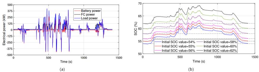 图2. 实验结果:(a) 功率分配;(b) 锂离子电池SOC