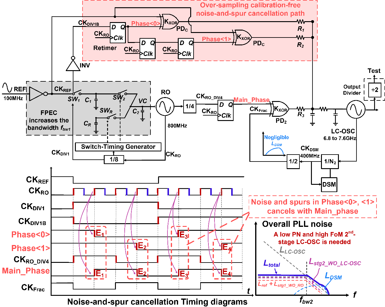几个月前,在课题组以及导师的帮助下,我以第一作者的身份完成并投稿了学术论文 《A Fractional-N Cascaded PLL Employing the Calibration-free Noise-and-Spur Cancellation technique》。该论文致力于以免校准的方式解决小数分频锁相环(Fractional-N PLLs)量化噪声,提出了一种采用免校准噪声与杂散消除技术的小数分频级联锁相环,如图1所示。