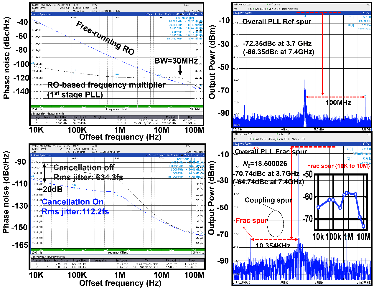 该架构通过引入过采样消除路径,实现了以下目标:1)通过过采样技术实现第一级整数锁相环的全频段噪声与杂散消除,消除噪声带宽限制并避免增益校准需求;2)通过多相位路径匹配实现噪声和消除路径对工艺、电源电压以及温度变化的高鲁棒性;3)通过优化的过采样消除路径实现低于1mW的功耗开销。值得注意的是,所提出的免校准噪声与杂散消除技术具有架构可扩展性,适用于其他类型的级联锁相环实现。