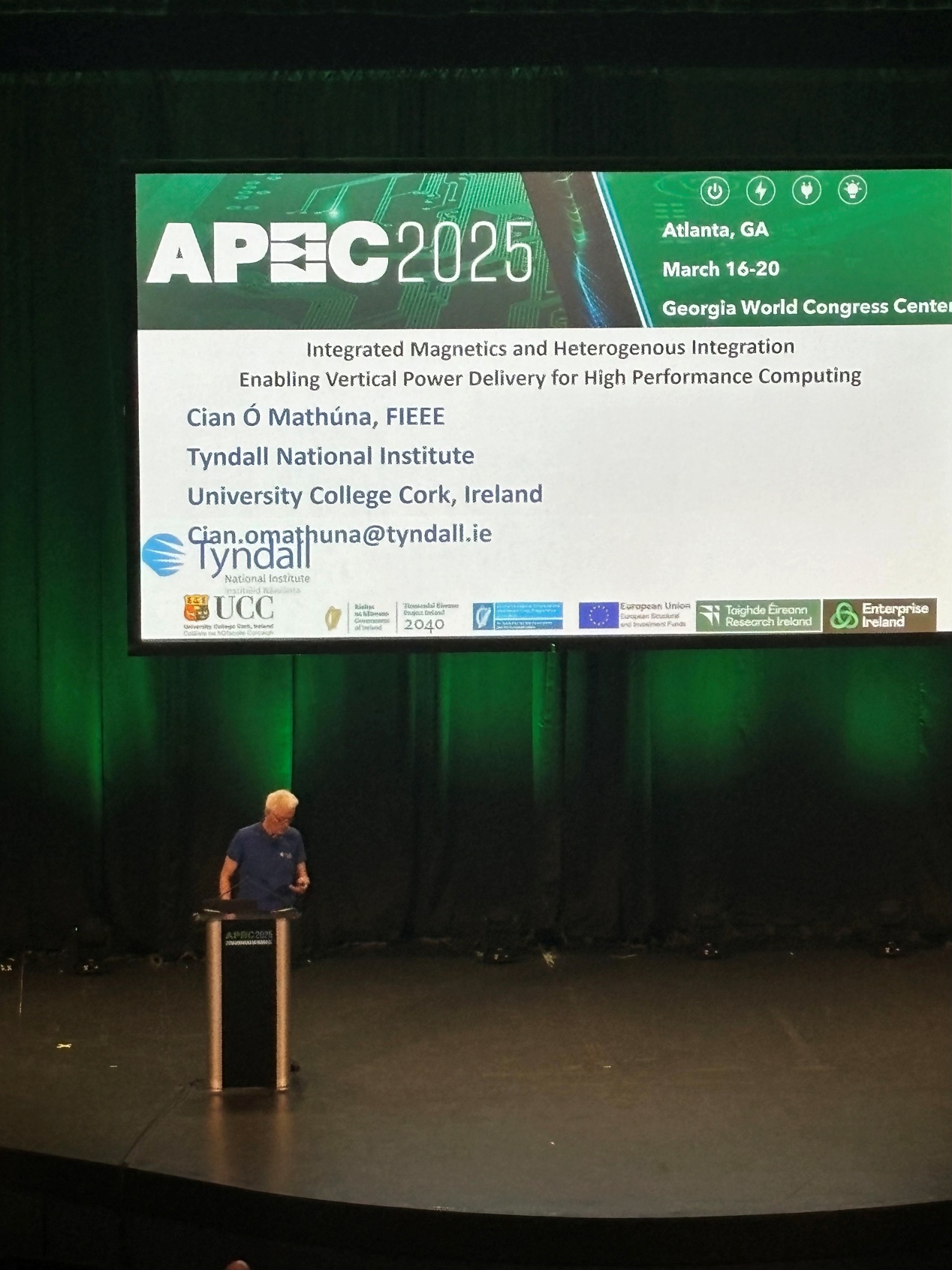 Tyndall研究所主任 Cian Ó Mathúna介绍了高性能计算(HPC)与 AI 芯片供电的新趋势。他展示了硅基集成磁性技术(MagIC)和PCB嵌入式磁性结构在垂直供电中的应用。这种创新设计可取代传统绕线电感,实现片上或封装内电源管理,显著提升功率密度与供电效率。