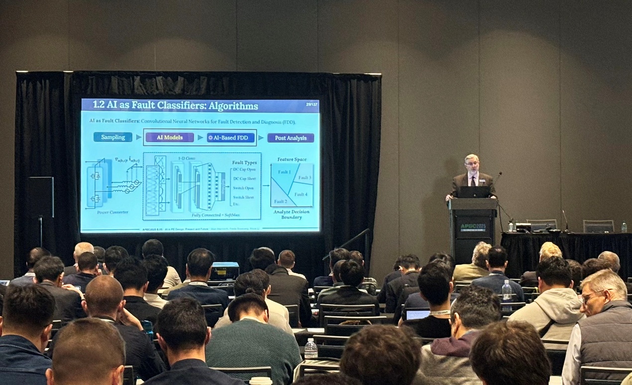 之后的一个讲座内容就相对硬核且前沿——电力电子设计中的AI。这场讲座深入讲解了人工智能(AI)在电力电子设计中的应用和影响,以及预见的未来发展趋势。让人们不禁深感人工智能在电力电子领域中的应用潜力无穷大,未来必将有更宏大的发展空间。这场讲座也是最受欢迎的讲座,会场座无虚席,从中也可以看出AI的影响力已经蔓延到各行各业,电力电子从业者也有紧迫感了。