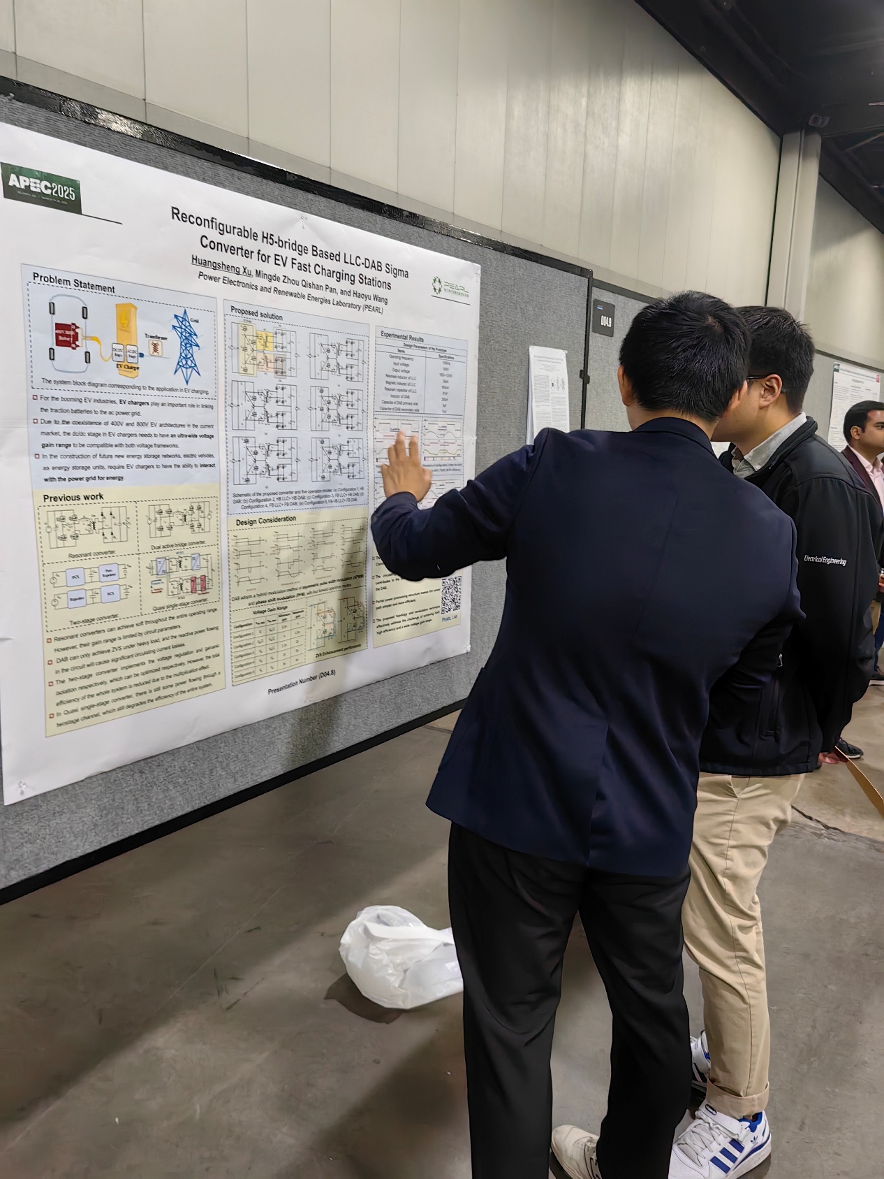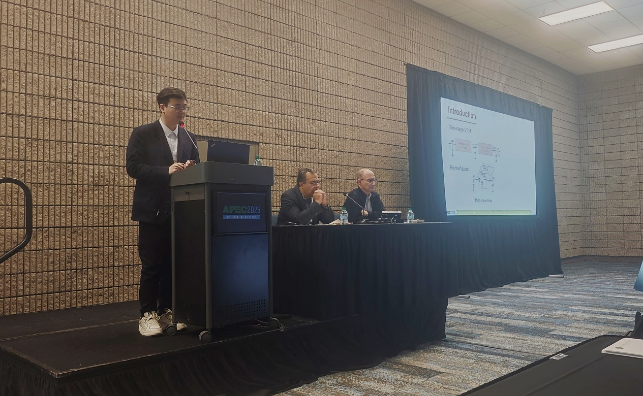 在APEC 2025的“对话报告”环节中,入选论文作者通过海报形式展示了电力电子领域的前沿研究成果。该环节以严格的同行评审为基础,聚焦最具创新性的技术解决方案,吸引了全球学术界与工业界专家的深度参与。来自pearl实验室的许煌盛同学作为入选者,围绕高增益双向变换器拓扑设计进行了海报展示,并与来自工业界和学术界的学者就技术瓶颈、设计思路、应用场景等议题展开了深入讨论。