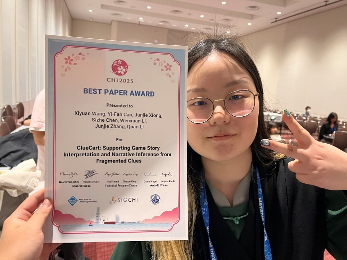 我的科研选题往往从个人兴趣出发。以获得 CHI 2025 最佳论文荣誉的 ClueCart 项目为例,灵感源自我对游戏叙事结构的长期关注与热爱。这种天然的亲近感,让我对问题本身有更深入的理解,也提高了从构思、实验设计到论文撰写各环节的掌控力。在这个项目中,我尝试将游戏文本分析方法与人机交互领域中的可视化机制结合起来,开创了一种新的视角。这种兴趣驱动带来的,不仅是创作的热情,更是一种敏锐的预判力:我能更快地识别实验设计中的潜在问题,及时调整方向,确保研究的推进更加高效。这种从兴趣出发、快速试错与持续优化的能力,在我多个项目的迭代中都起到了决定性作用,也让我对科研逐渐建立起稳定的信心。